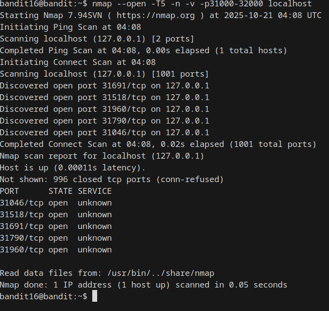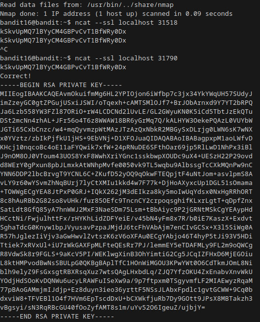 Ahora para esta parte debemos de tomarlo de forma aleatoria y para ello vamos a hacerlo usando el comando ncat y tener la contrasela de bandit 16, si no la tienes copiada y no recuerdas cual era, simplemente lee el archivo que esta en esta ruta: /etc/bandit_pass/bandit16, aqui es a la suerte y deberas escoger el puerto que se vea mas convincente o puedes probar uno por uno